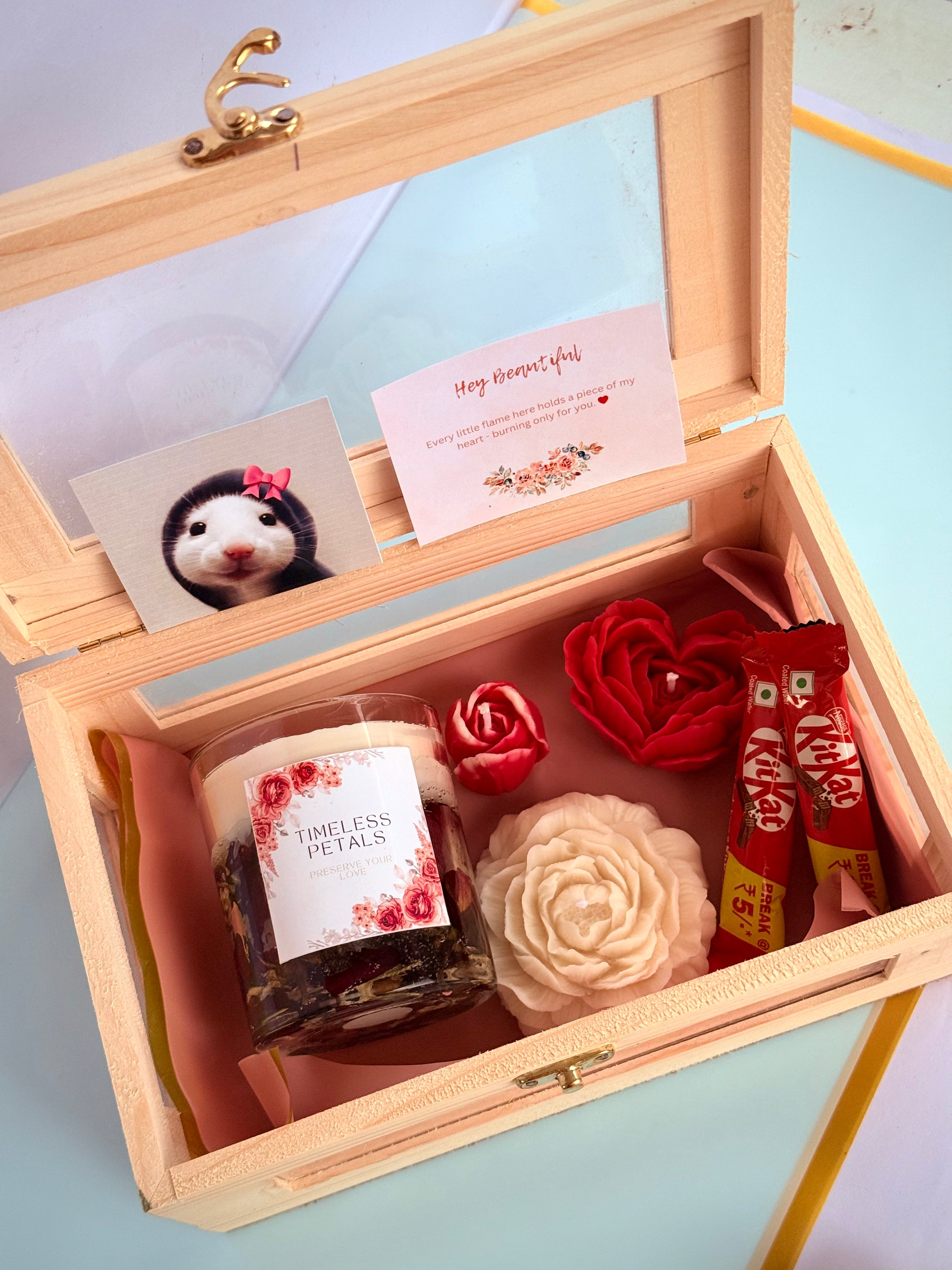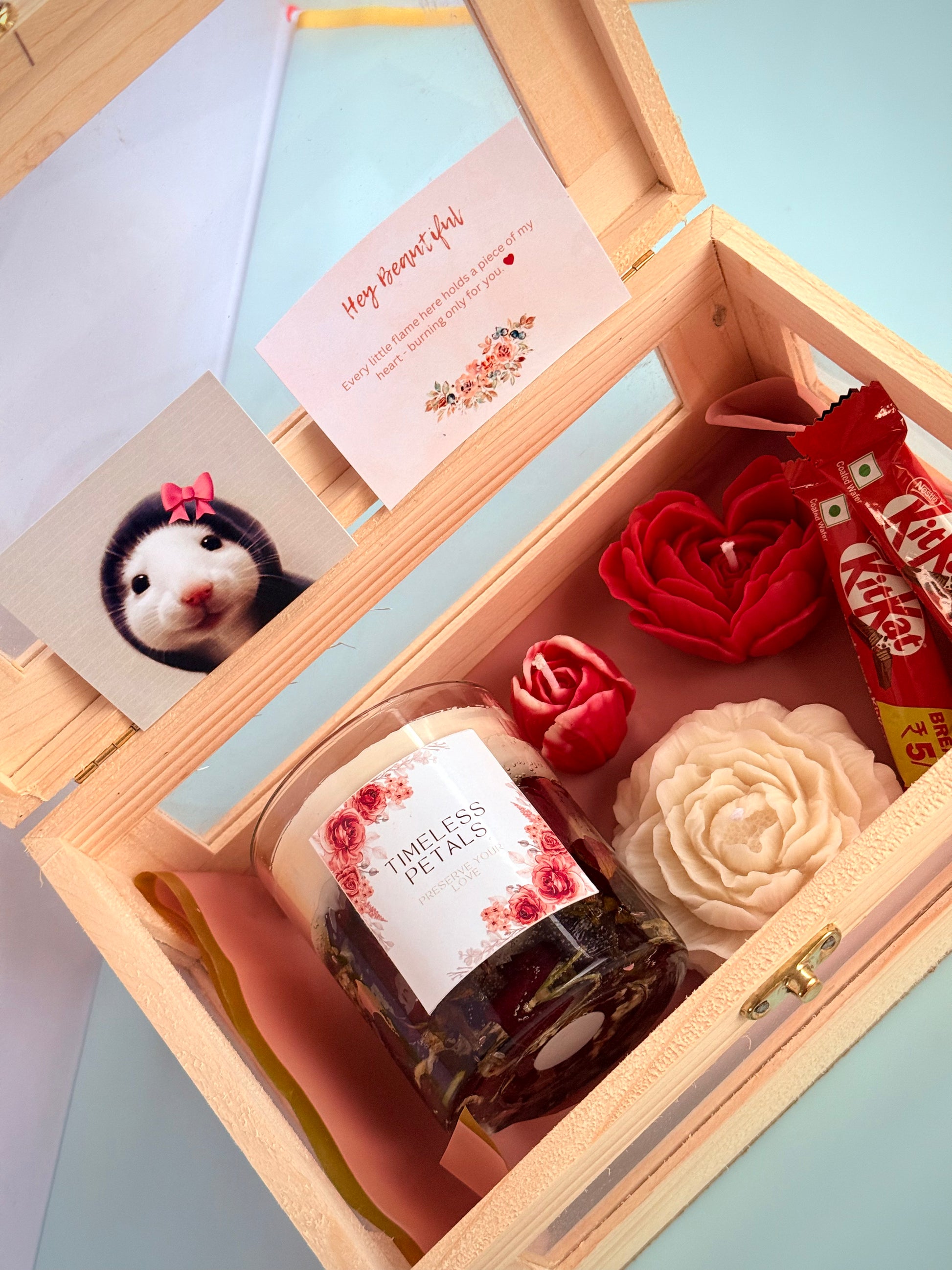 Step into a world of soft petals, gentle glows, and heartwarming memories with this thoughtfully curated floral candle hamper. Designed for those who find beauty in the little things, this set features four of our most cherished creations — each one telling a unique story. Timeless Petal captures the romance of real roses, preserved forever in wax and memory. Rose Amoure offers a delicate, comforting aroma that soothes the senses with every flicker. The Peony candle brings a touch of classic charm, blooming with soft elegance. Finally, the Tulip candle adds freshness and grace, like a spring morning in full bloom. Whether you’re gifting it to someone special or treating yourself to moments of calm and luxury, this hamper is a celebration of love, warmth, and everything beautifully floral.