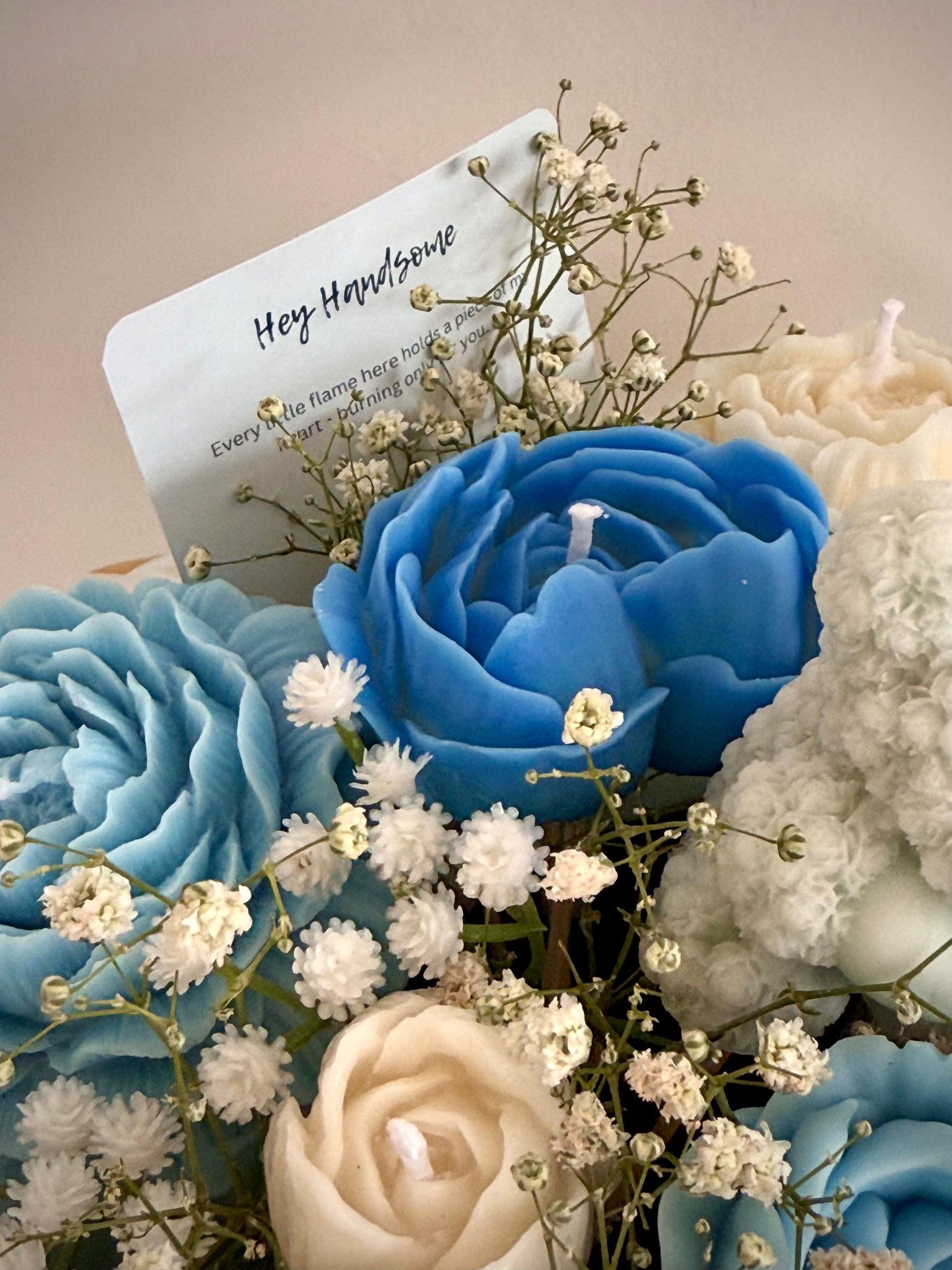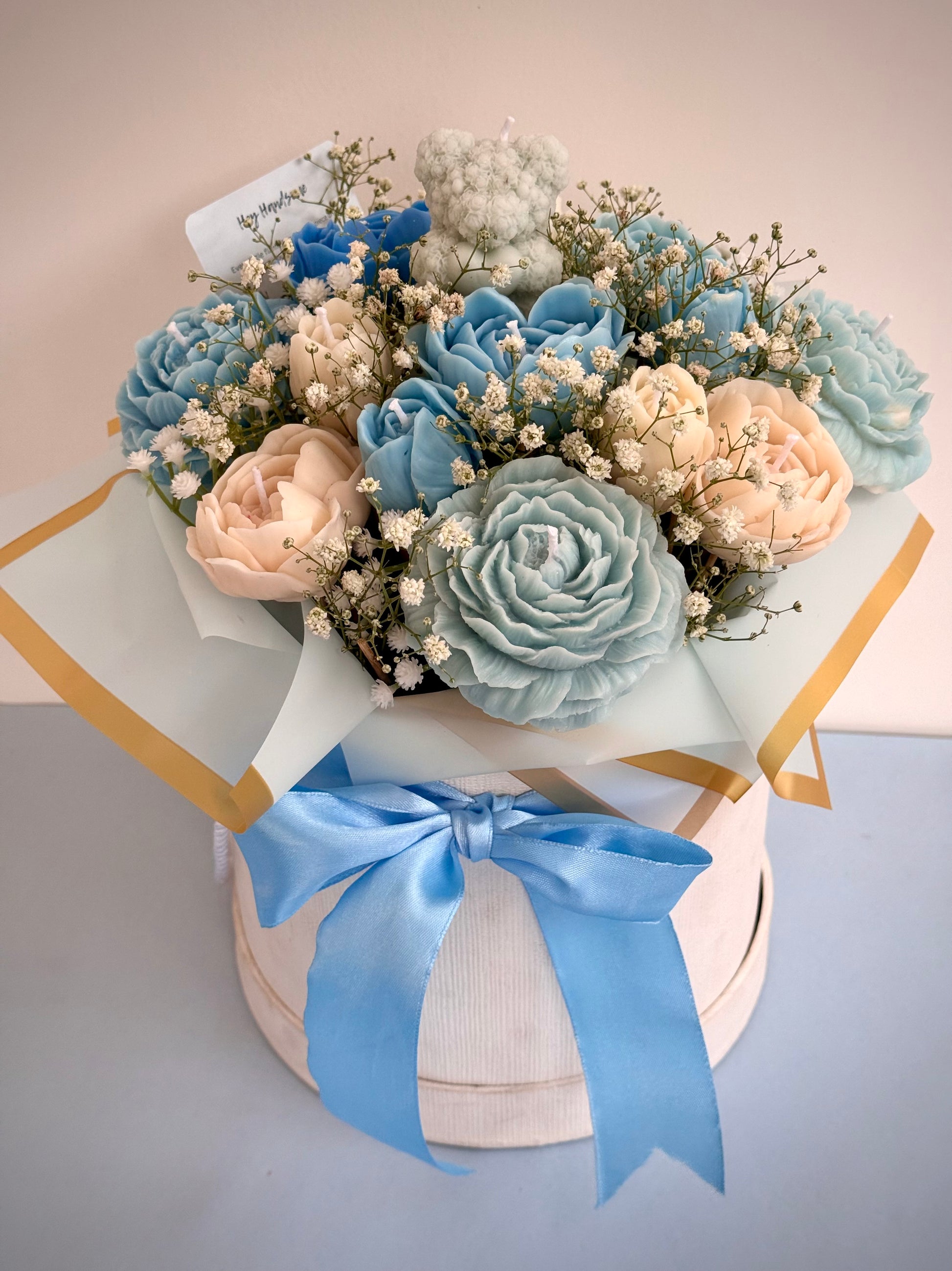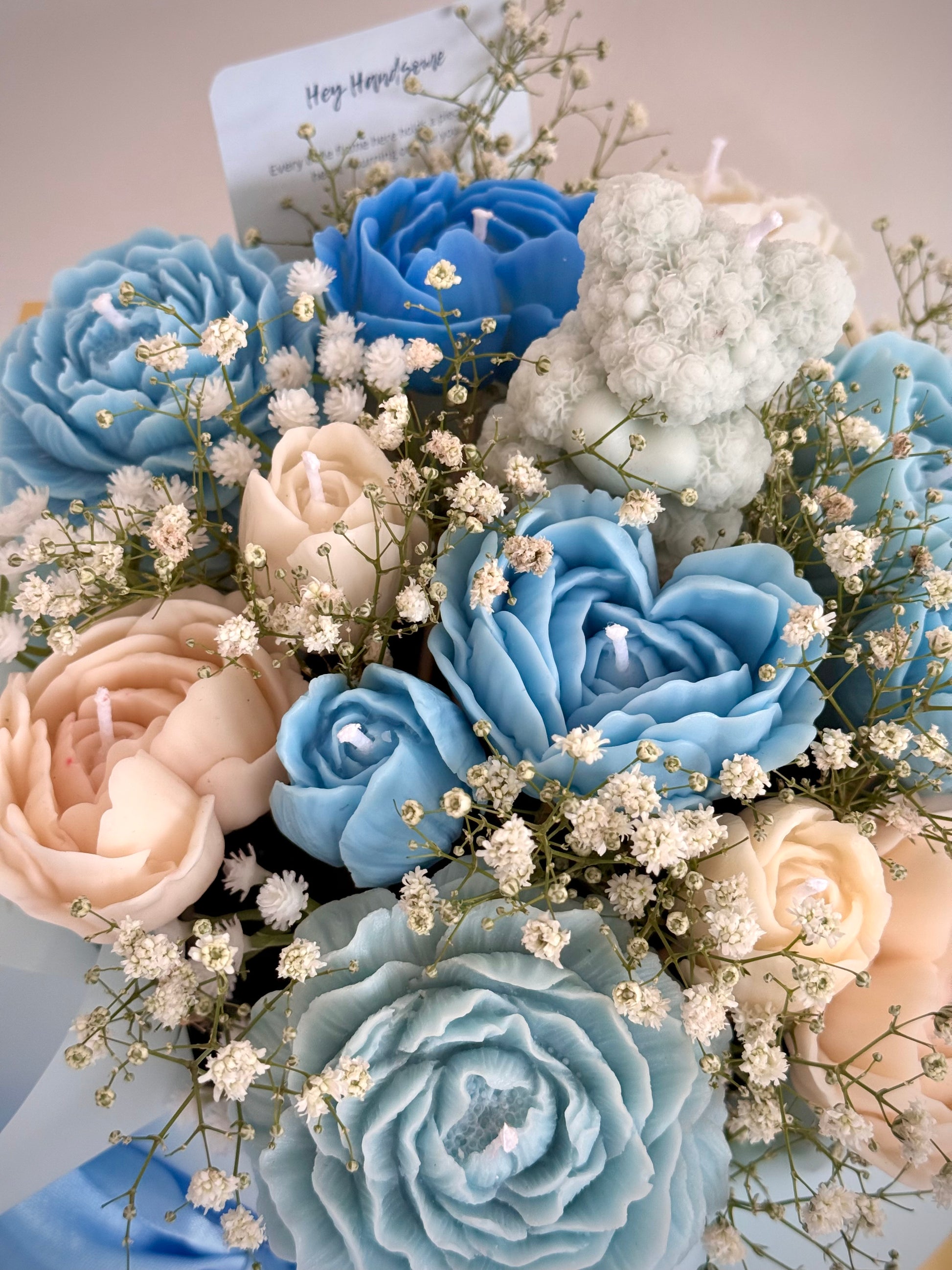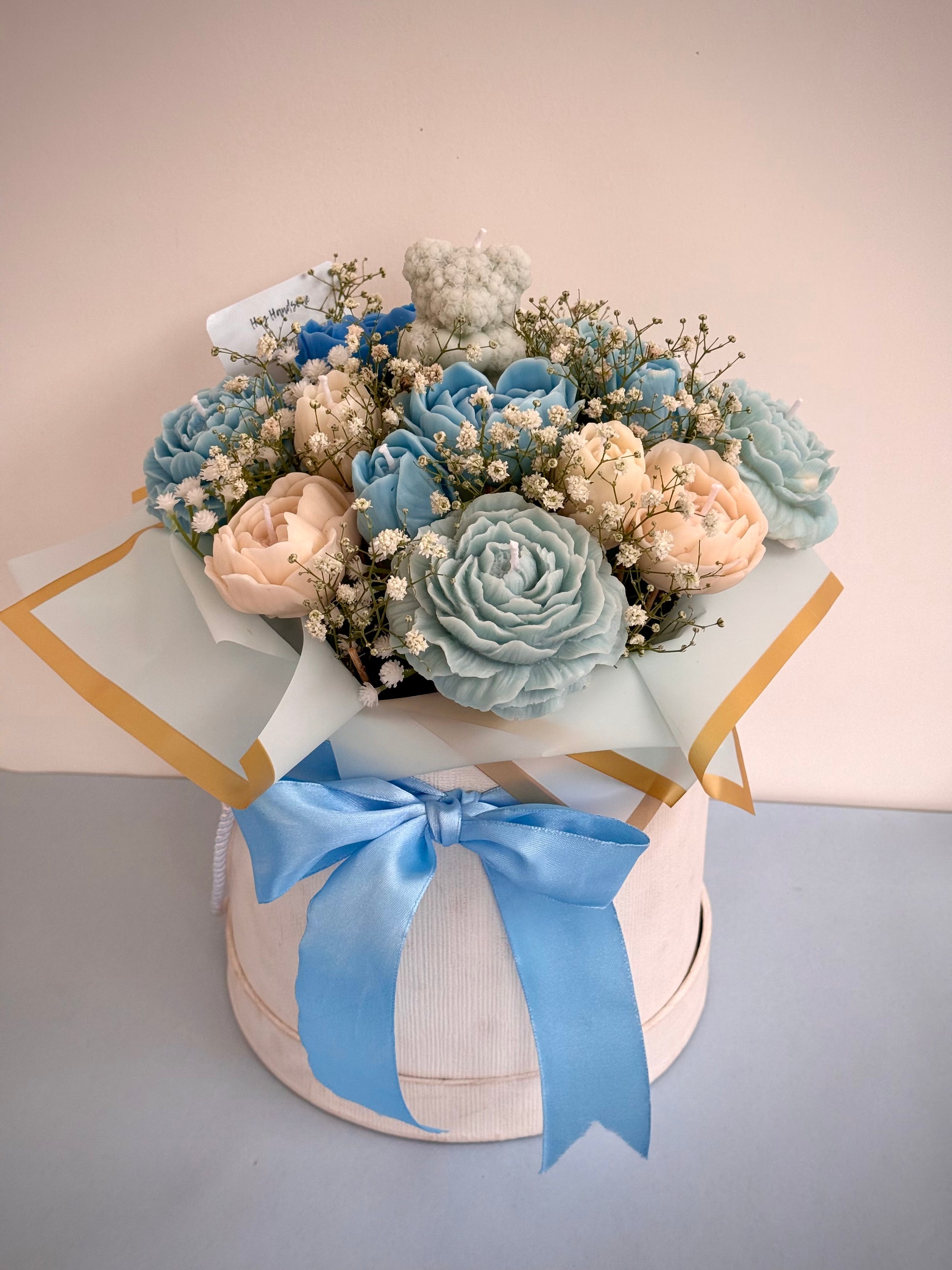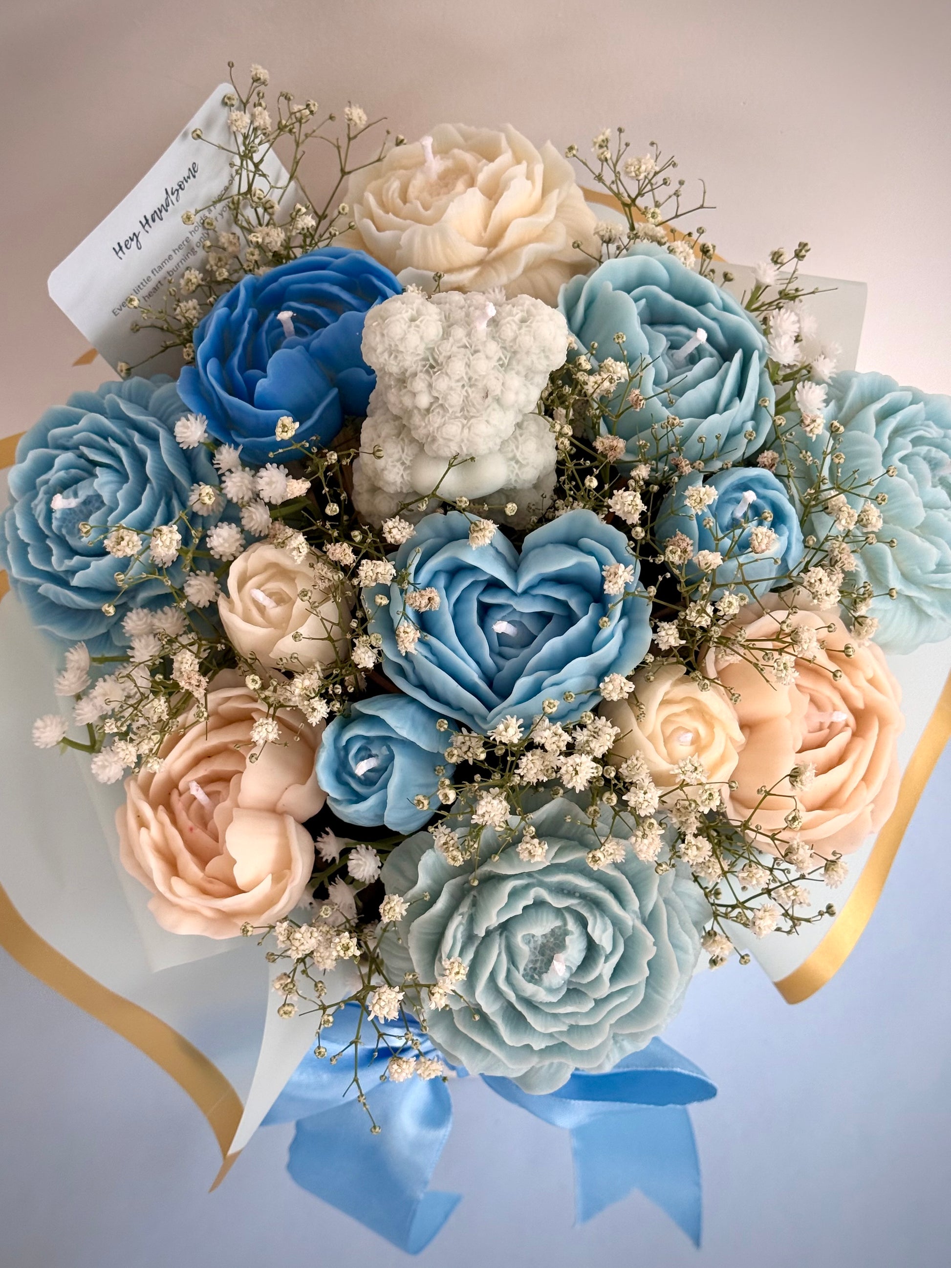 This handcrafted arrangement features an enchanting mix of pastel candle blooms including delicate tulips, peonies, hearts, and an adorable teddy, all designed to melt hearts before they melt themselves.